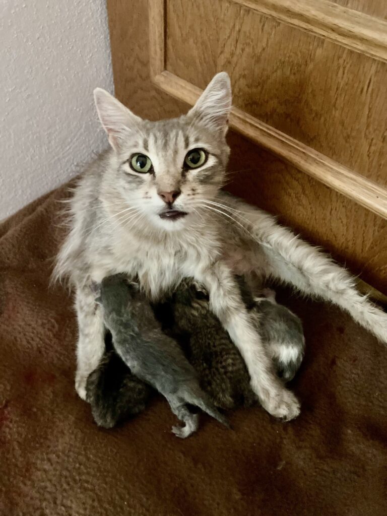 Doch ich war da. Bei ihr. Welch Ehrerbietung Daisy mir hier erteilte! Ich durfte dabei sein. Das vierte Mal durfte ich Hebamme sein. Katzenhebamme. Hier an einem wunderbaren Ort, zu dem mich Zeichen geführt haben. Jeden einzelnen Augenblick, jede der vier Geburten ihrer Neuankömmlinge, genoss ich und dokumentierte ich mit Bildern, und ich war da, wenn sie mich brauchte. Baby Nr. 1 wollte nämlich gleich unter die Decke krabbeln, da war es wohl sinnvoll für mich einzugreifen und es mit Vorsicht und einem Tuch zu den Zitzen zu leiten. Ein magischer Moment folgte dem anderen. Um 6.10h erblickte das vierte Kitten das Licht der Welt. Jedes hat eine andere Farbmischung – anthrazit, hellgrau, weiß-grau und bräunlich. Sie sind sehr ähnlich dem ersten Wurf – Denny, Dora, Daria, Diggi sehen fast genauso aus wie die vier entzückenden „Frischlinge“. Voll Freude aber doch sehr geschafft – von Reise, neuer Umgebung, Geburt, ohne Schlaf – sah Daisy mich erleichtert an. Sie kümmerte sich rührend um die Kittens, ich musste ihr das Essen vor die Nase stellen, weil sie gar nicht weggehen wollte, so verantwortungsbewusst war sie.