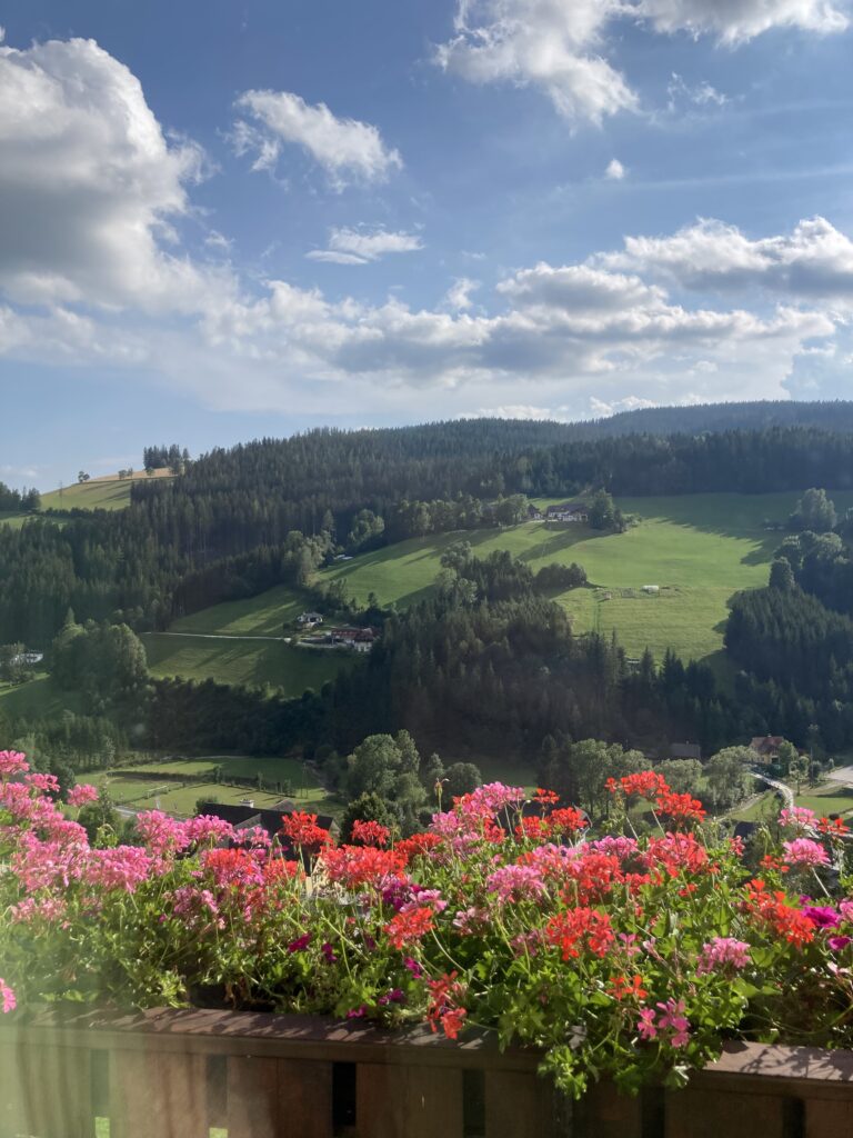 Daisy und ich machten uns also mit unserem Mini-Van auf den Weg. Sie war so entzückend und brav. Das kleine Katzenklo stand unten am Boden beim Beifahrersitz. Auf einer Rast während unserer stundenlangen Reise ging sie sogar auf die kleine Seite. Sie ließ alles geschehen und vertraute mir voll und ganz. Das war sehr erleichternd für mich. Da ich uns die lange Fahrt bis zum Pflegeplatz nicht antun und trotz Bett im Auto lieber mehr Raum zur Verfügung haben wollte, machte ich an einem Ort, wo mich Zeichen hinführten und ich schon mal als Kind war, Rast und fand ein Zimmer für uns. Ein wundervoller Ausblick war uns dort gewährt. Ein einfaches, günstiges Zimmer mit Frühstück, sogar mit Balkon, doch wichtiger war, der Gastgeber war einverstanden mit meiner trächtigen Samtpfoten-Begleitung. Daisy entdeckte schnuppernd ihre neue Umgebung. Unerschrocken sah sie bei der geschlossenen Balkontüre raus, dann sprang sie aufs Bett, schaute ins Bad, setzte sich auf die Couch, unter den Tisch … inspizierte alle Ecken und Enden. Plötzlich verschwand sie. Wie magisch war sie weg. Obwohl ich davor gründlich geprüft hatte, ob es keine Schlupflöcher gab, konnte ich sie nun dennoch nicht finden. Es war als wäre ich in einem falschen Film oder die Matrix hätte Daisy verschluckt. Hat sie sich dematerialisiert? Das Bett war inklusive der Nachtkästchen mit einer Holzleiste umrandet, sie konnte da nicht drunter sein! Oh doch! Nach minutenlangem Suchen, die sich in meinem Schreck wie eine Ewigkeit anfühlten, war sie wie verzaubert aus ihrem Versteck hervorgekrochen. Wie passte sie da mit ihrem dicken Bauch überhaupt durch?