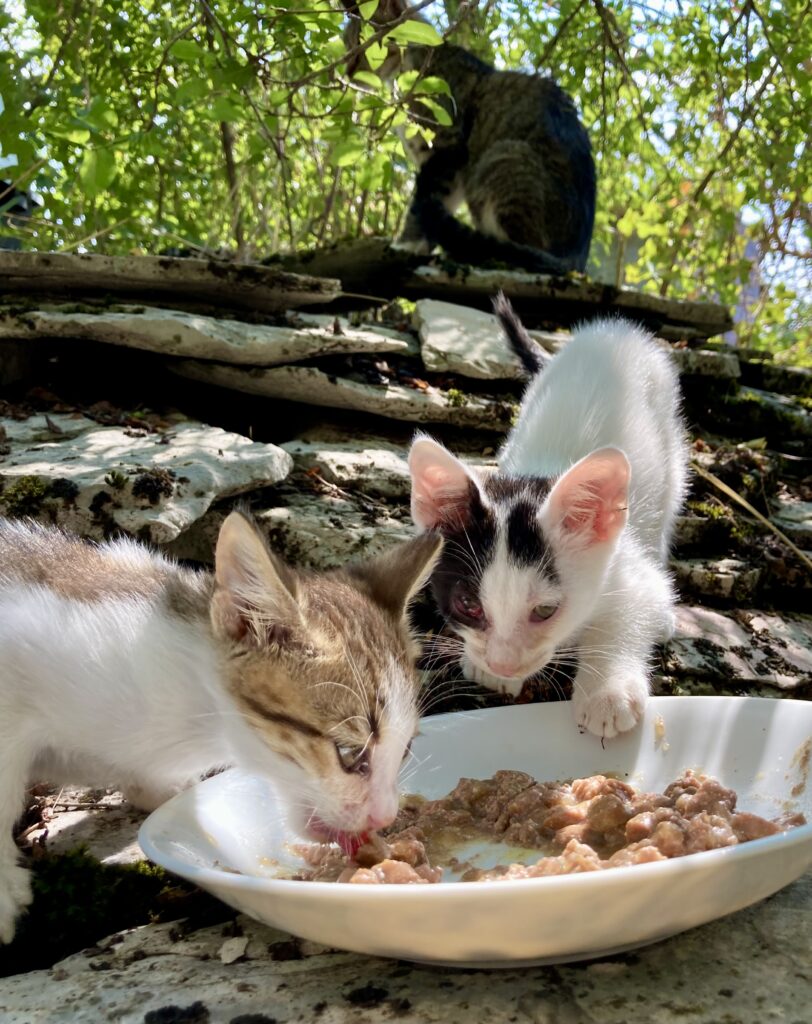 Zunächst gab es anderen Zuwachs im alten Steindorf im Hinterland Dalmatiens. Wir nahmen erst einen kleinen Racker wahr, der blind neben seiner Mutter Vroni – wie wir sie rufen – kauerte, die Augen zu und verklebt. Vinko nannten wir den etwa gut zwei Wochen jungen Kater. Beide Fellnasen waren ausgehungert, so päppelten wir sie erstmal mit Nassfutter für Katzen auf. In ihrem Revier bekamen sie von den Einheimischen wie alle anderen Straßenkatzen manchmal für Katzen schädliche Substanzen – vom Brot eingeweicht in für Katzen unverträgliche Milch, oder in Zwiebelsuppe, Chilli-Bohnen, in Knoblauch gekochte Schweineschwarten, alte Schokomuffins und ähnliches, Reste, die Mensch nicht mehr essen wollte, das sie mit dem Dorfhund teilen mussten.