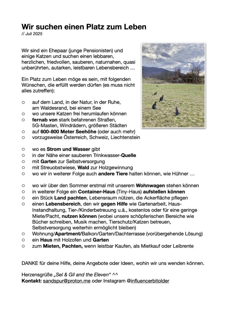 Denn: In all diesen unzählig erlebten WUNDERschönen Abenteuern mit unseren geliebten Fellnasen haben wir unsere Hoffnung nie aufgegeben, einen WUNDERvollen Platz zum Leben für uns alle beziehen zu dürfen. Bald wird sich der passende Platz unserer Wünsche, Vorstellungen und Träume zeigen, weil wir wissen, er ist schon da, er ist bereits im Feld. Er möchte uns nur noch finden. Falls du das liest und einen Platz weißt, wo unsere Katzen in Sicherheit leben können, fernab von stark befahrenen Straßen, wo wir auch andere Tiere halten können, wo wir wertschätzenderweise in quasi unberührter Natur leben dürfen, lass es uns bitte wissen! Im angehängten Foto findest du so einige unserer Herzenswünsche für unseren Platz zum Leben für „Sel & Gil and the Eleven and more“. DANKE … und …